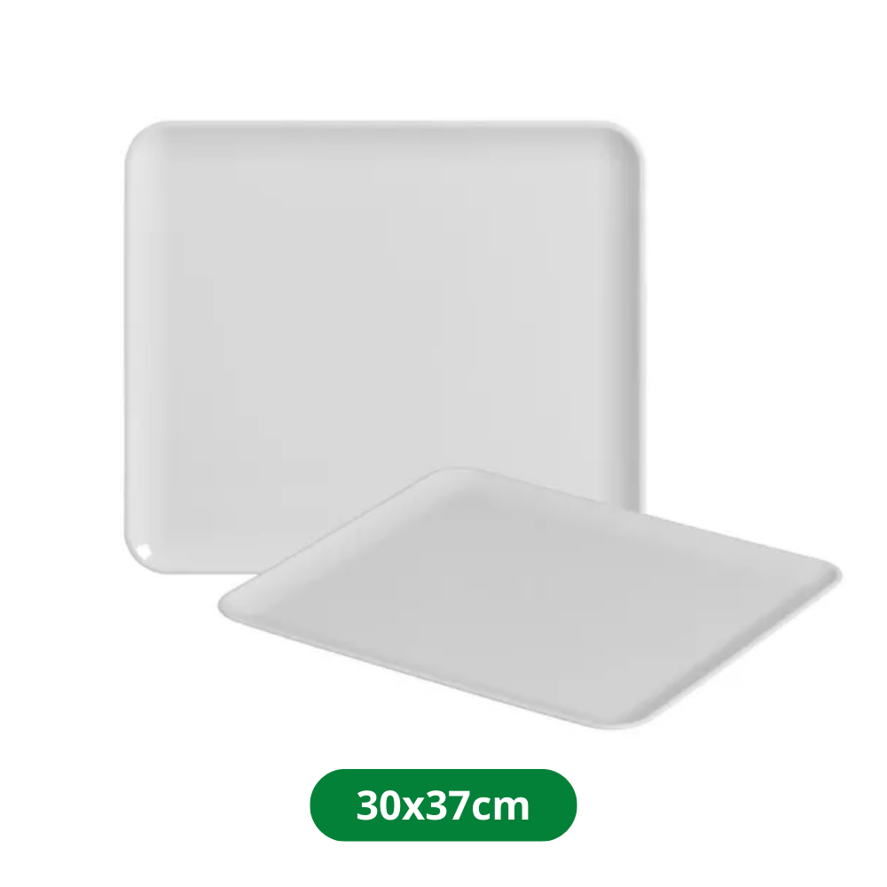 Bandeja retangular de plástico branco, com medidas de 30× 37 cm. Ideal para servir doces, salgados, petiscos ou pratos em festas e eventos. Design sofisticado, acabamento de alta resistência e visual elegante que integra bem em decorações temáticas ou ambientes premium