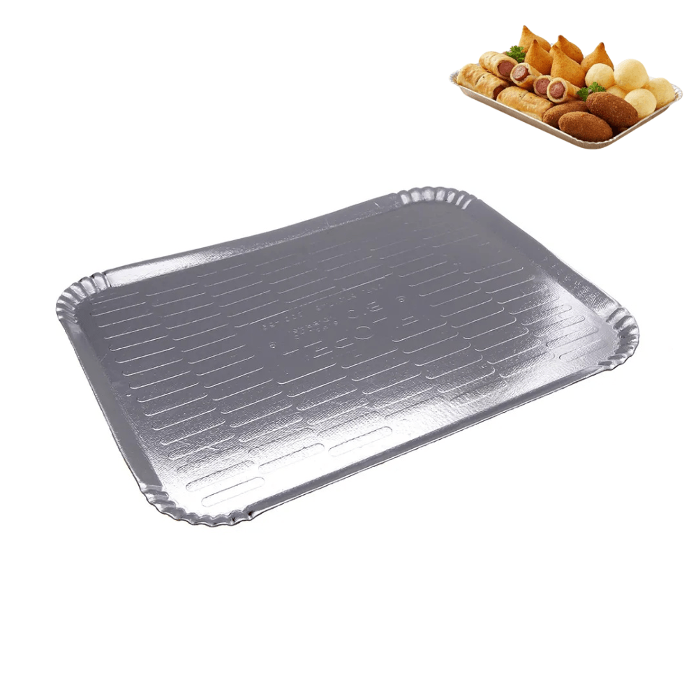 Bandeja resistente e laminada, ideal para apresentação de doces, salgados e produtos de confeitaria. Possui acabamento rígido, visual elegante e proteção contra umidade e gordura, garantindo praticidade e ótimo aspecto na exposição e no transporte.