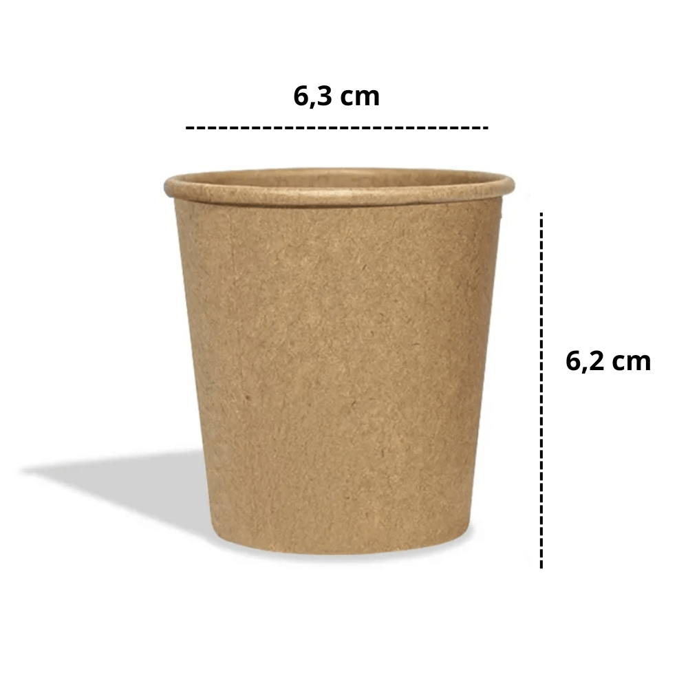 Copo descartável de papel Kraft com capacidade de 120 ml, formato compacto ideal para espresso ou doses. Produzido em papel biodegradável com revestimento interno resistente a bebidas quentes, combina um estilo rústico e ecológico com praticidade.