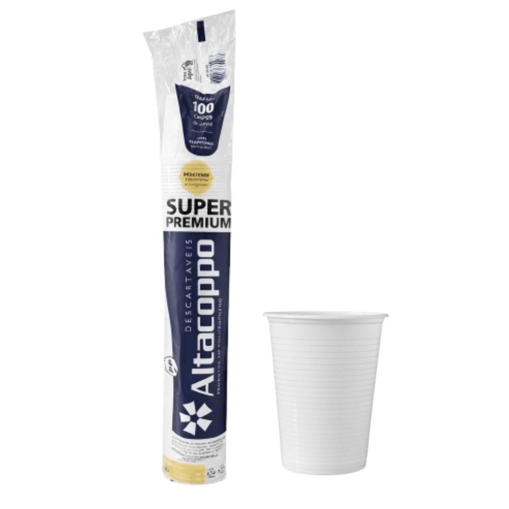Copo de descartável Altacoppo no material polipropileno (PP), na cor branca, com capacidade de 180 ml. Resistente e higiênico, ideal para uso em escritórios, eventos, festas e estabelecimentos comerciais. pacote com 100 unidades, garantindo praticidade e ótimo custo-benefício.